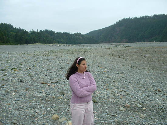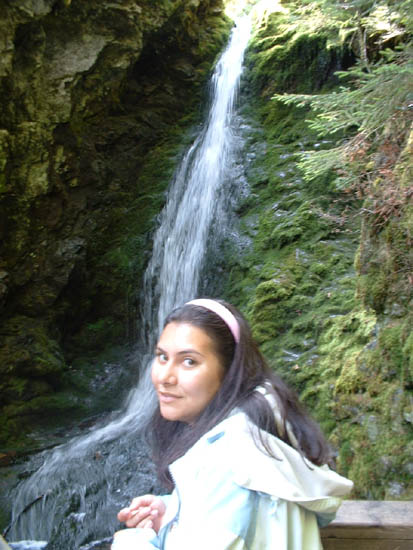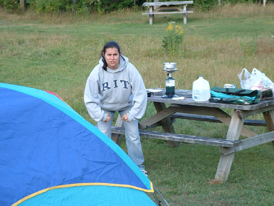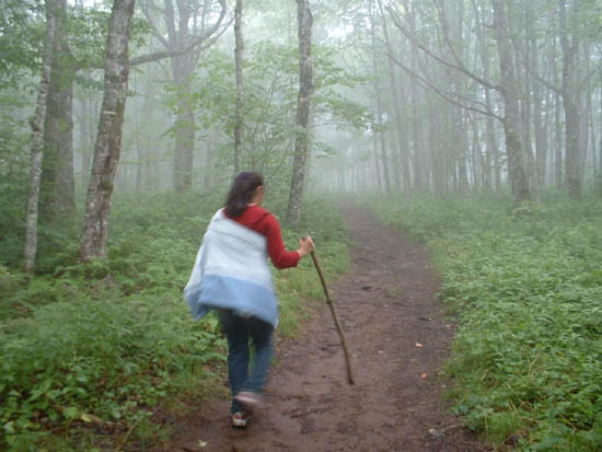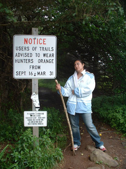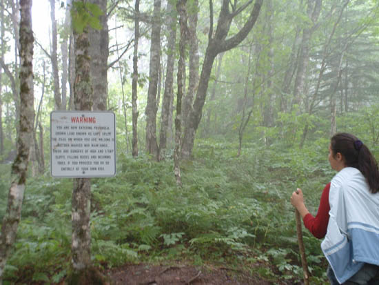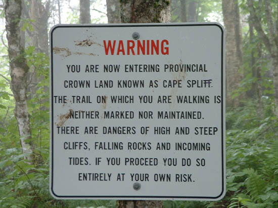 Val at trailhead to Cape split at Scots Bay, Nova Scotia Bottom sign says plan on 5 hrs |