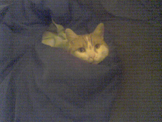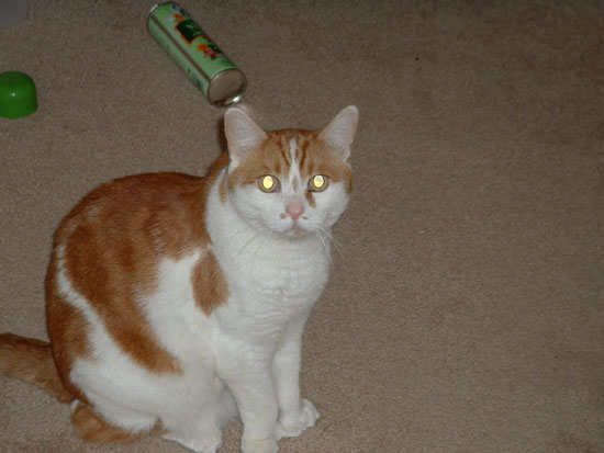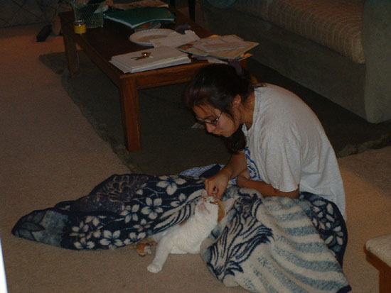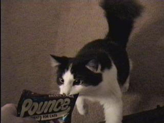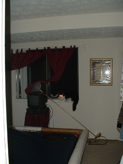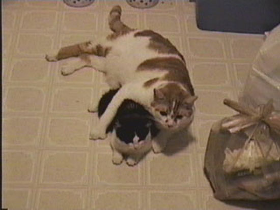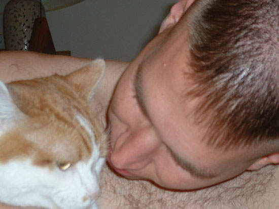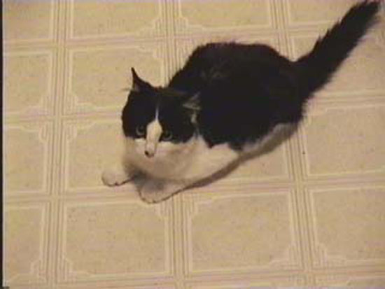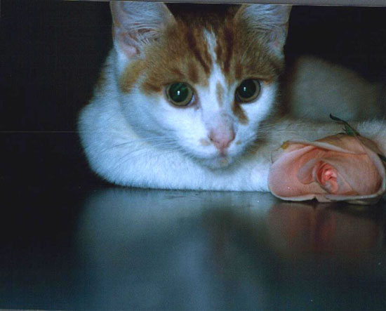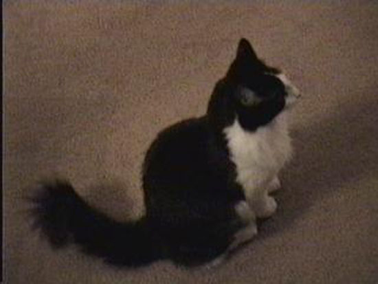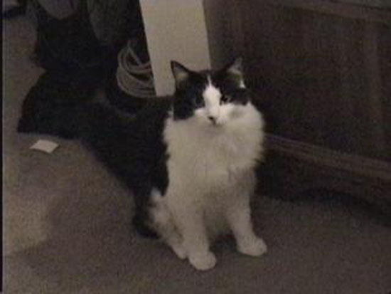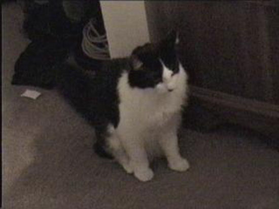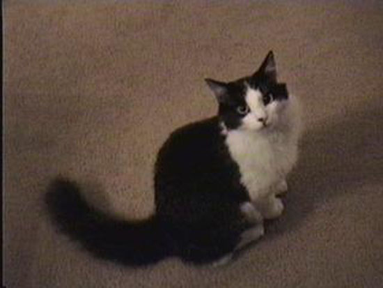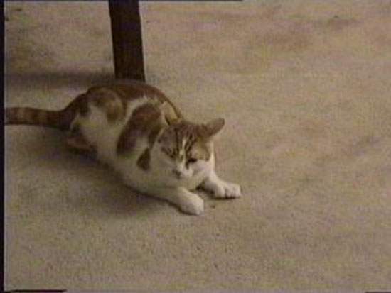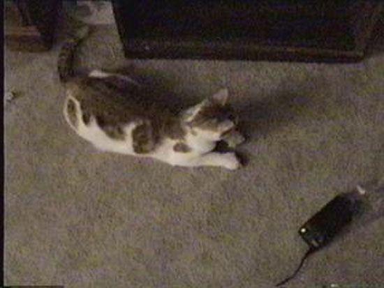 One night Val and Andy had an argument over the milk, resulting in Val going to the convenience store "herself" to buy a fresh gallon. On the way back, she saw the glowing eyes, and stopped the car on the side of the road to get a closer look, and possibly grab the cat. Unfortunately, she locked the door, with the engine running and the keys in the ignition. She wasn't more than 1/2 mile from home, so she walked back, and Andy rode his bike back with the spare keys and unlocked the car. We attempted to catch the cat, but he eluded us that night. The night after, we purchased a Mag light flashlight to aid us in our search for this cat. It wasn't hard to find him, because he stayed in the same general area. We stopped the car, determined to pick this cat up. Eventually, we chased him into a sewer pipe, flushed him out, then Valarie chased him across the street and finally caught him.. not without getting bitten first, though. The poor creature was scared stiff, was still a juvenile cat, was all wet (it had rained) and had worms. We kept him in our closet of a bathroom for a couple days, to make sure he was OK and didn't have rabies. Since then, Ziggy was named and has become a part of our family. He is still a very skittish cat, running away at the slightest noise or ruckus, unlike Julian who would lie on his side even if an anvil were falling on top of him. Ziggy still comes onto the bed every night and every morning to be petted. He also has a nasty habit of peeing on clothes that have been laid on the floor. I guess that will just keep us vigilant about keeping the house picked up. |