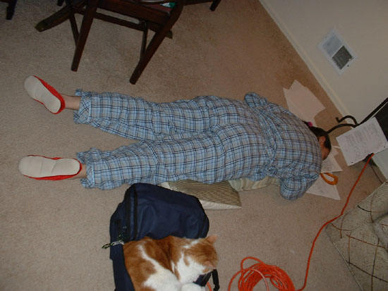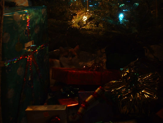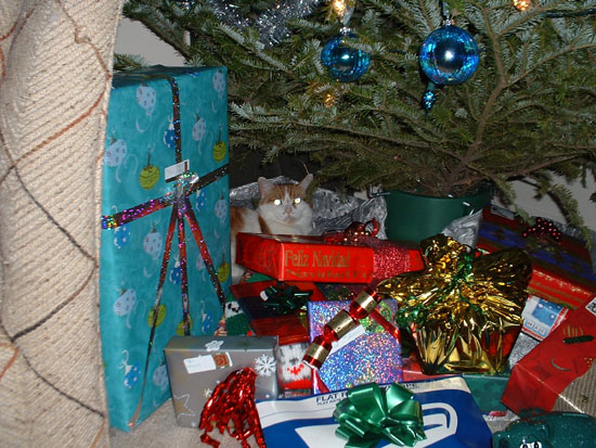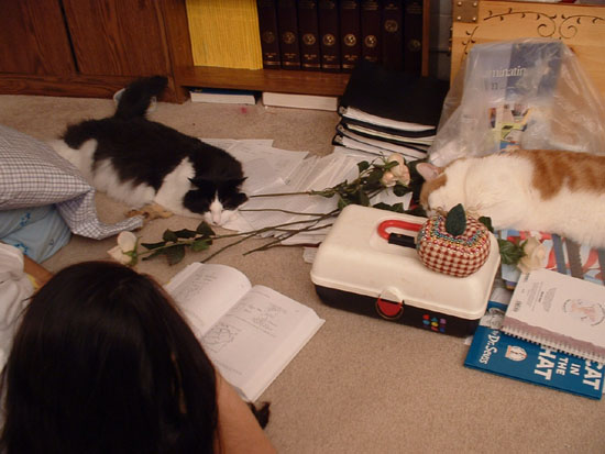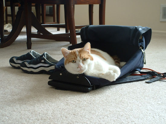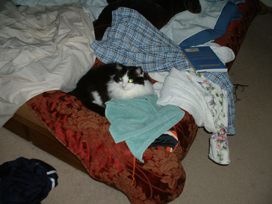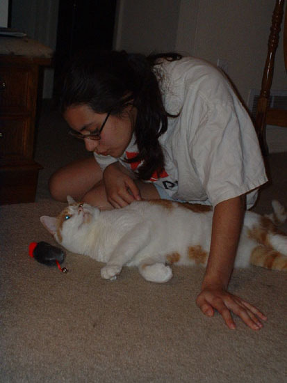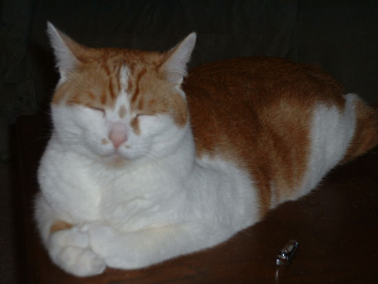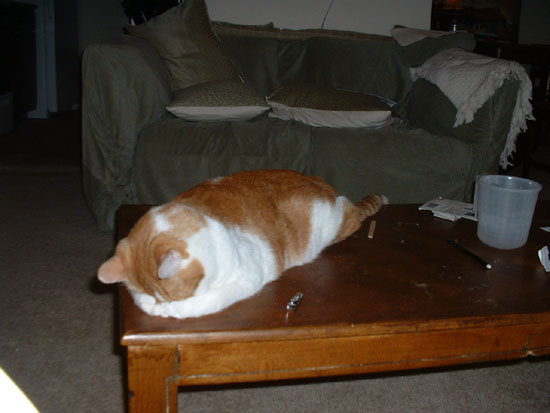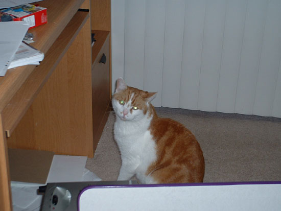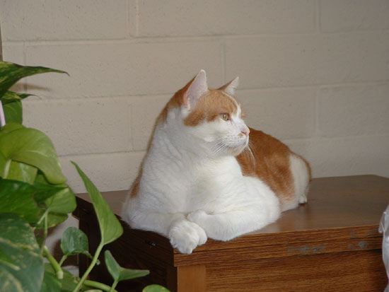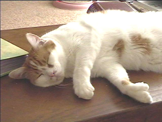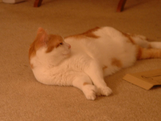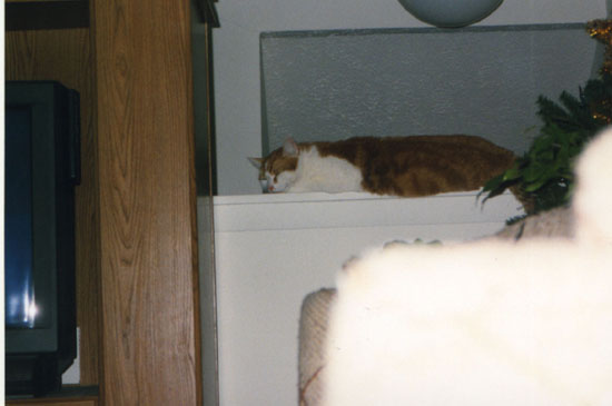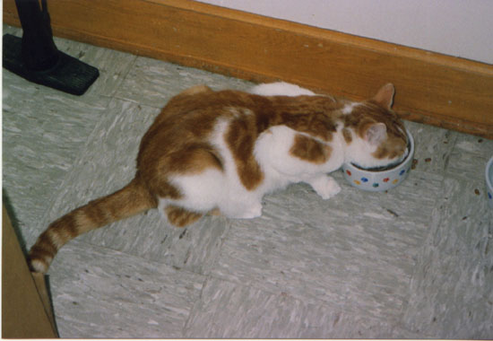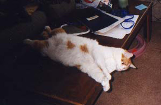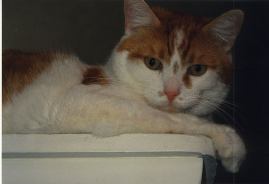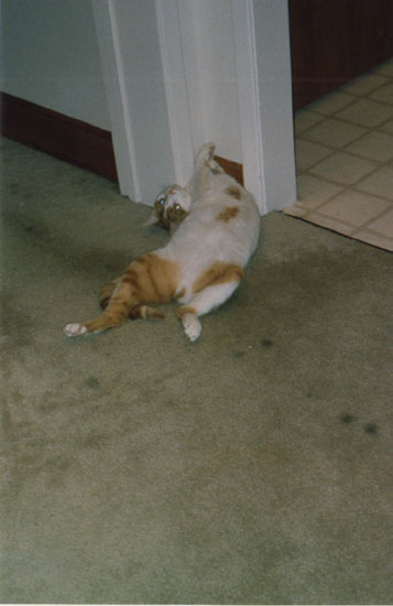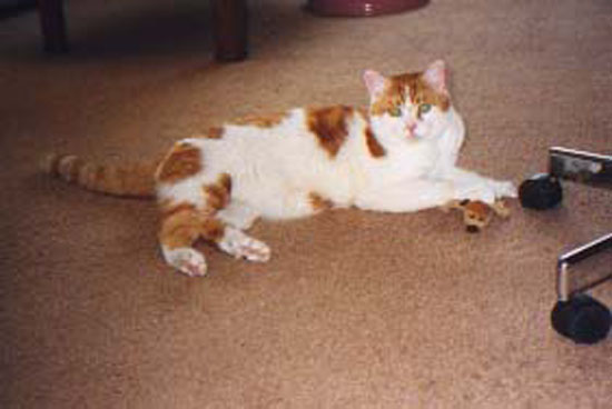 The same day that Andy left for the encampment, he picked up Julian from an animal rescue service in Chili, NY. He was advertised in the paper as 'tiger striped'. He was very friendly, and in the carboard carrier that he came with, he kept sticking his little kitten arm out of the air hole to say hi. A note was left for Valarie on top of a can of cat food in the kitchen to "look under the bed", since Julian had hidden himself there and it didn't look like he was going to move. Soon after, Julian liked to wake us up in the morning by jumping on the bed (he still does most days), then sneezing in Andy's face. Yuck! He quickly grew, then grew fat (20 lbs at one point!). He's on a permanent diet, eating only 3/4 cup diet food each day. However, he's down to a "big boned" 17 lbs. |